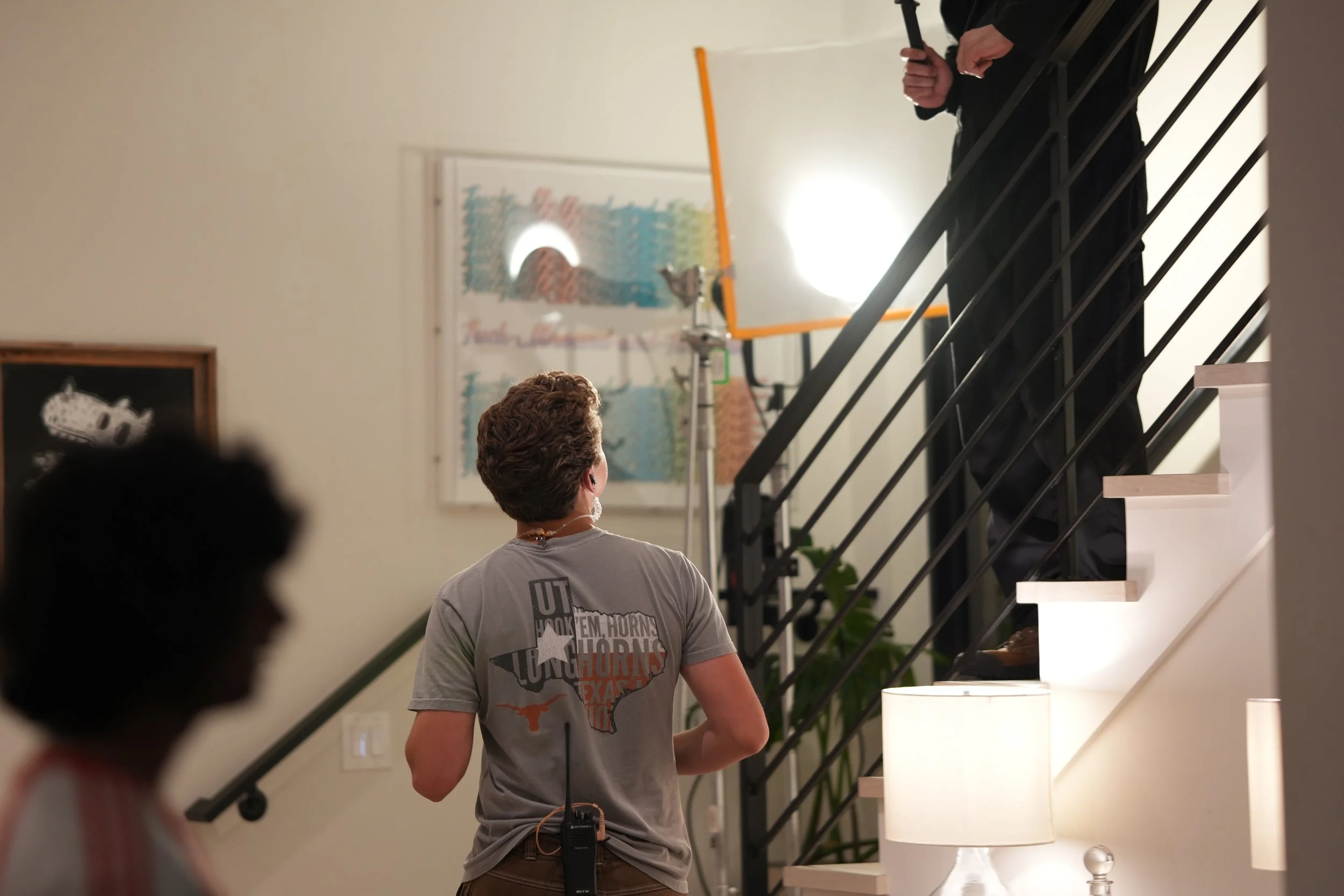 A person standing on a staircase talking to two other people, one of whom is seated and the other is blurred in the foreground. The person on the stairs is dressed in black, holding a phone, and is engaged in conversation. The seated person has their View fullsize