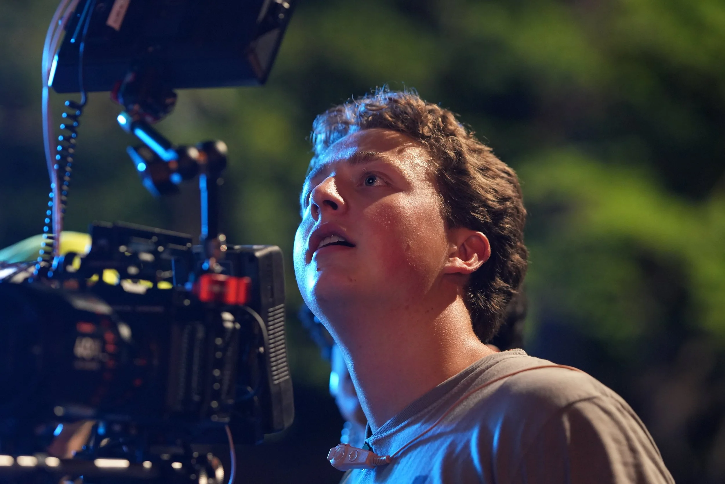 A young man with curly hair looking up at a camera rig during night filming outdoors. View fullsize