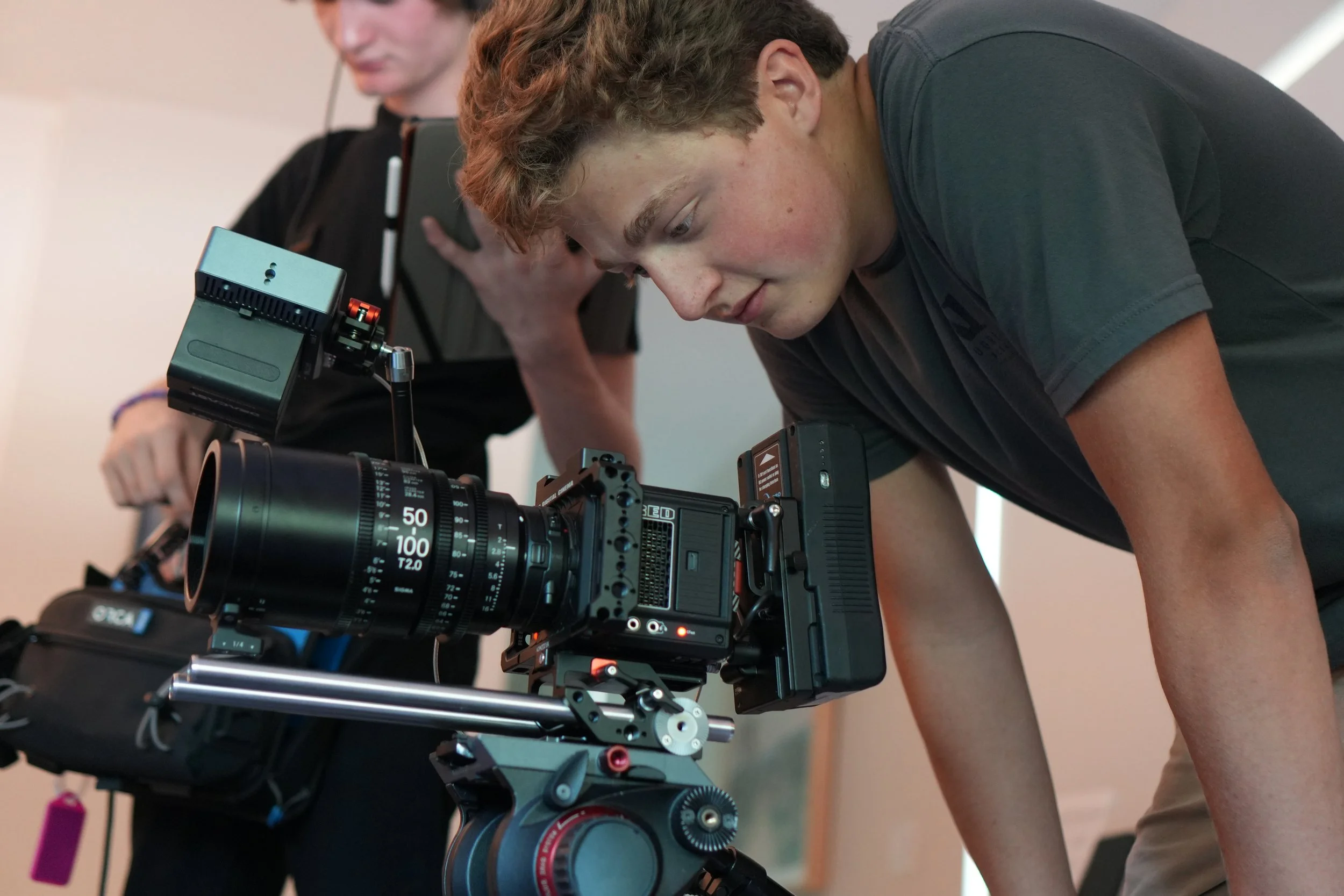 Two young men working with a professional video camera and equipment, one leaning over and focusing on the camera, the other standing in the background.