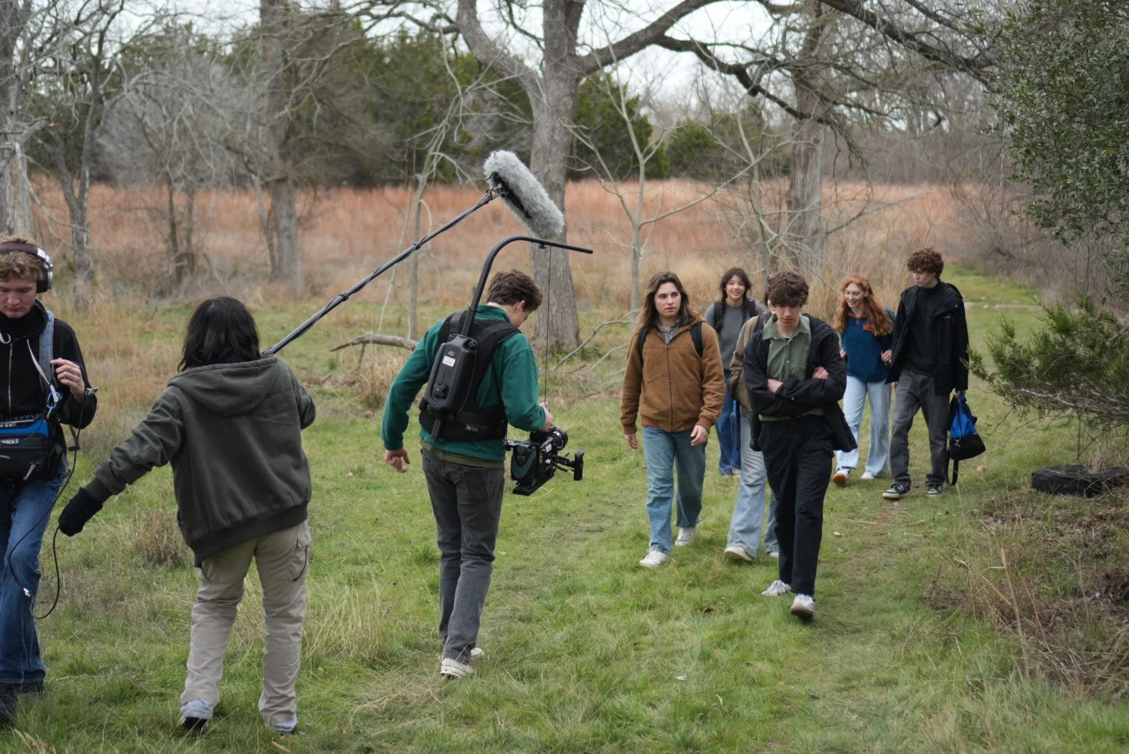 A film crew walking through a grassy outdoor area with trees, filming or recording, with equipment such as a boom microphone and camera, and several young people walking and talking.