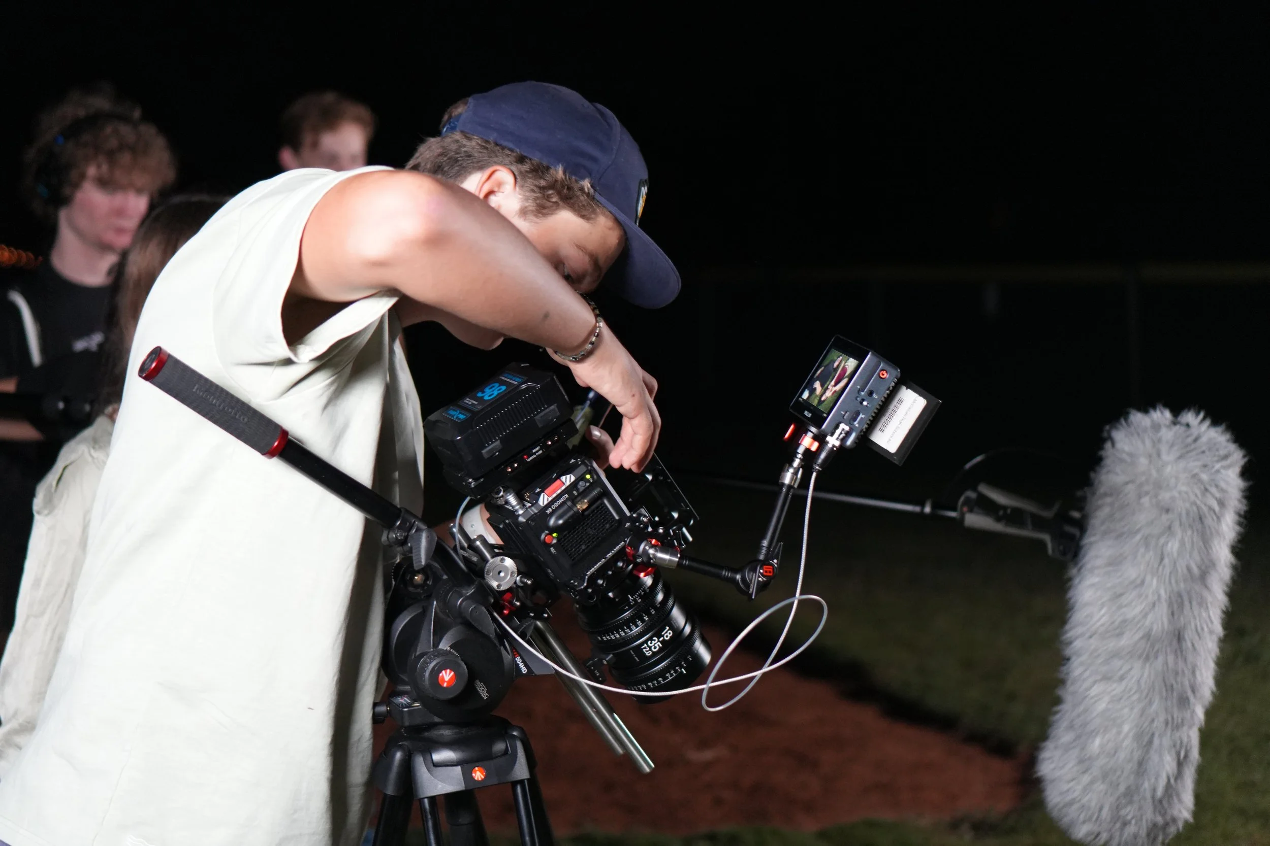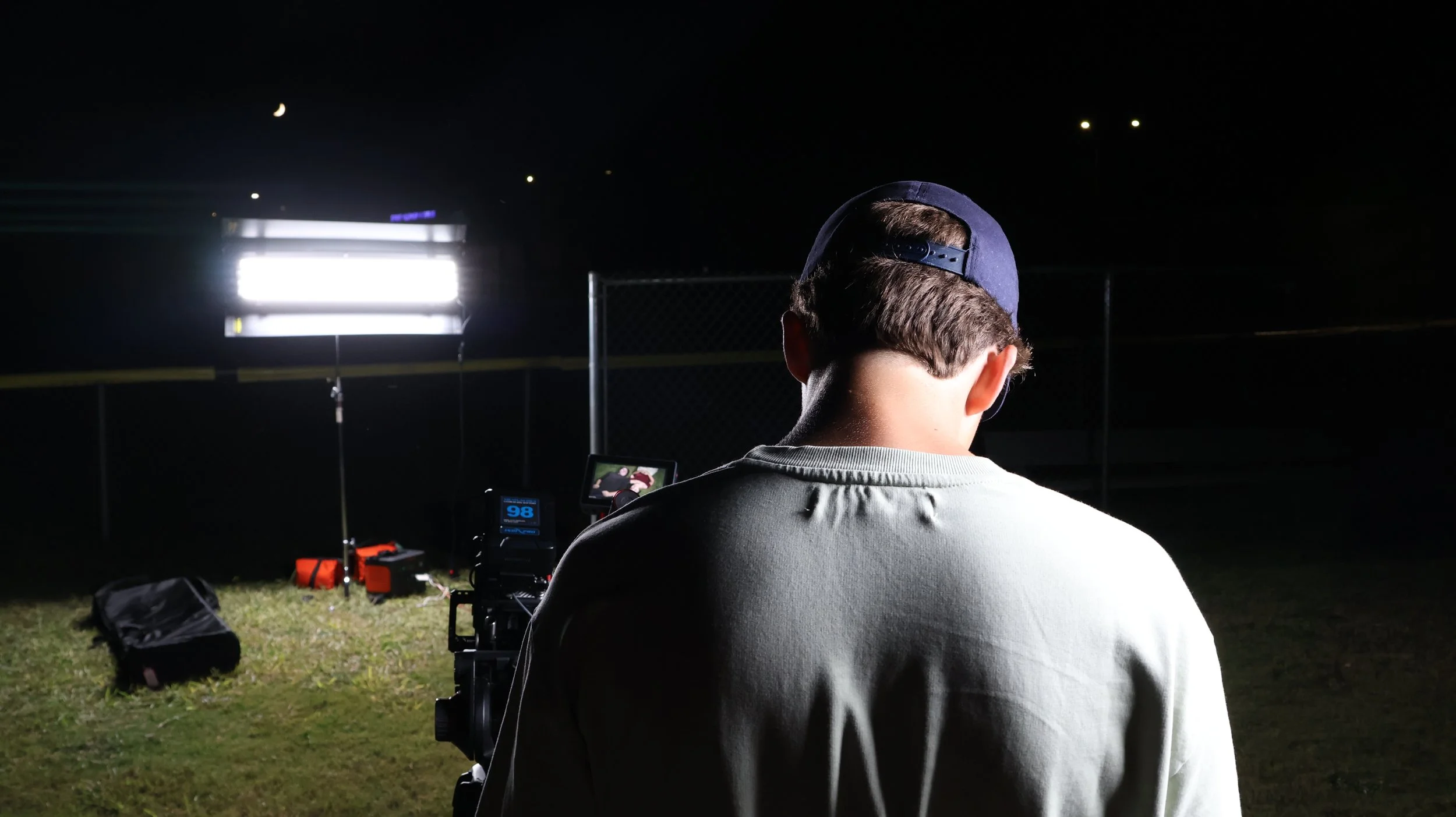 A young man wearing a baseball cap and glasses, seen from behind, operating a camera on a tripod during night-time, with a bright light and a sports field in the background.
