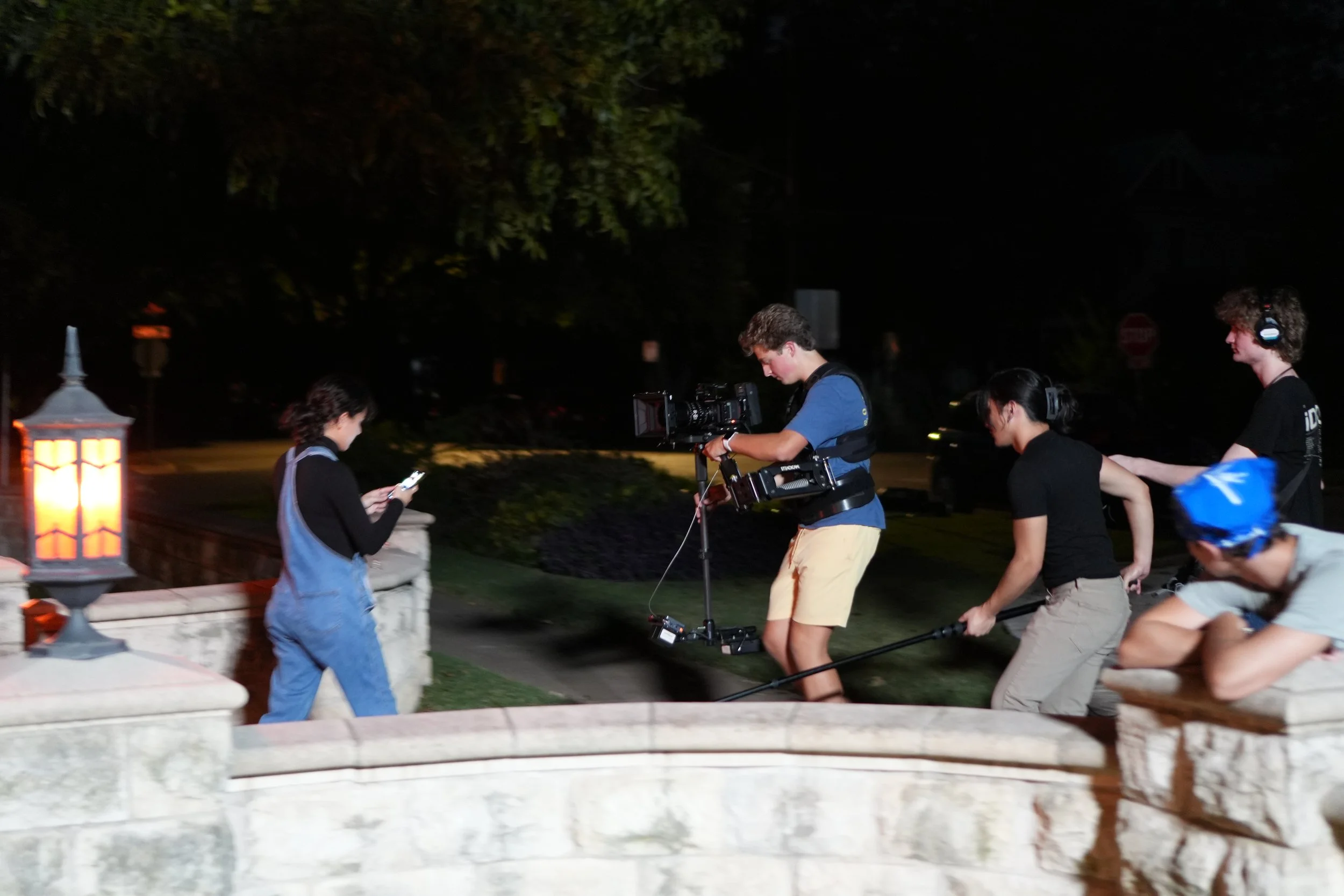 A young man with curly hair looking up at a camera rig during night filming outdoors.