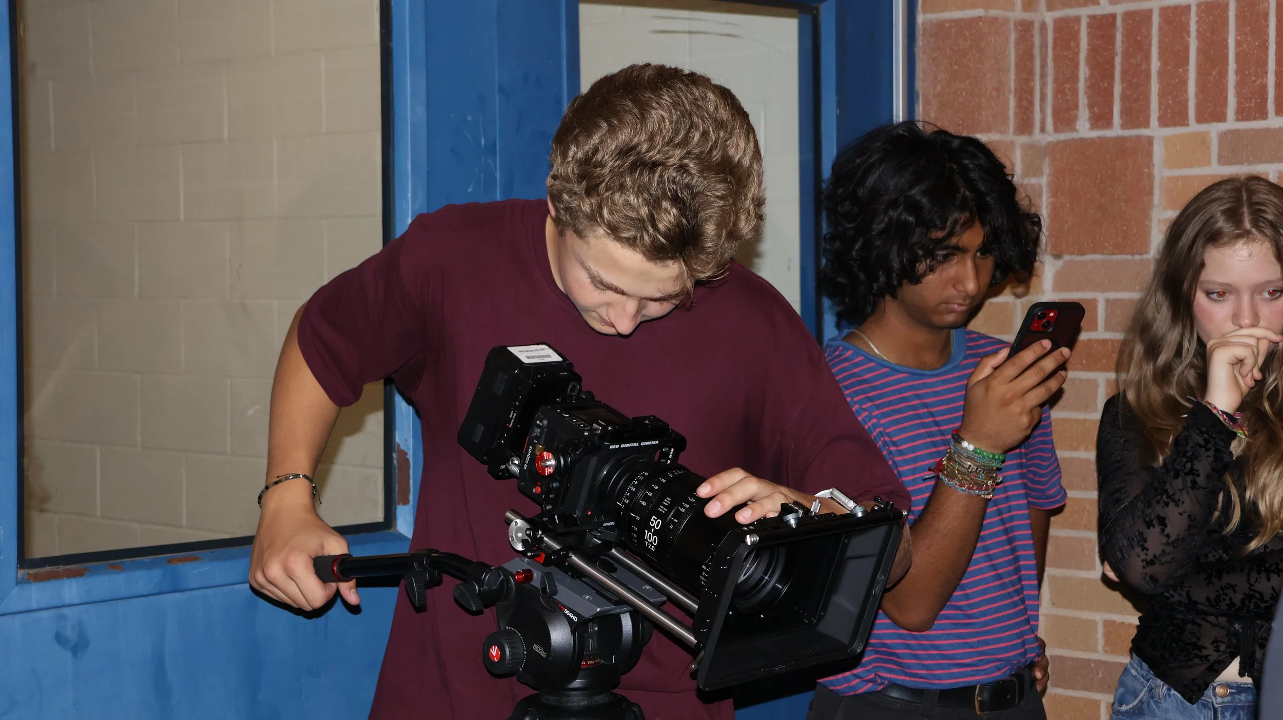 A person operating a professional film camera with two young women standing nearby, one looking at her phone against a brick wall and a window with a blue frame. View fullsize