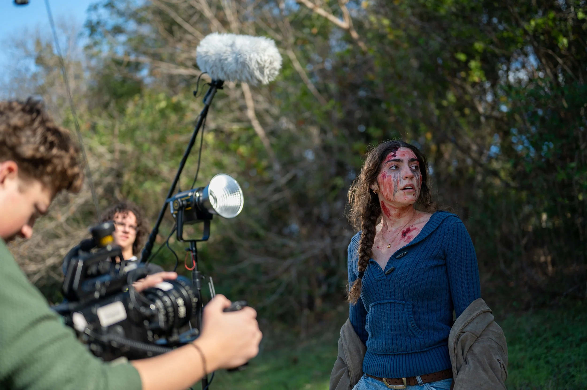Behind the scenes of a film shoot shows a woman with blood and makeup on her face and neck, standing outdoors with trees in the background. A crew member operates filming equipment, including a camera and a boom microphone. View fullsize