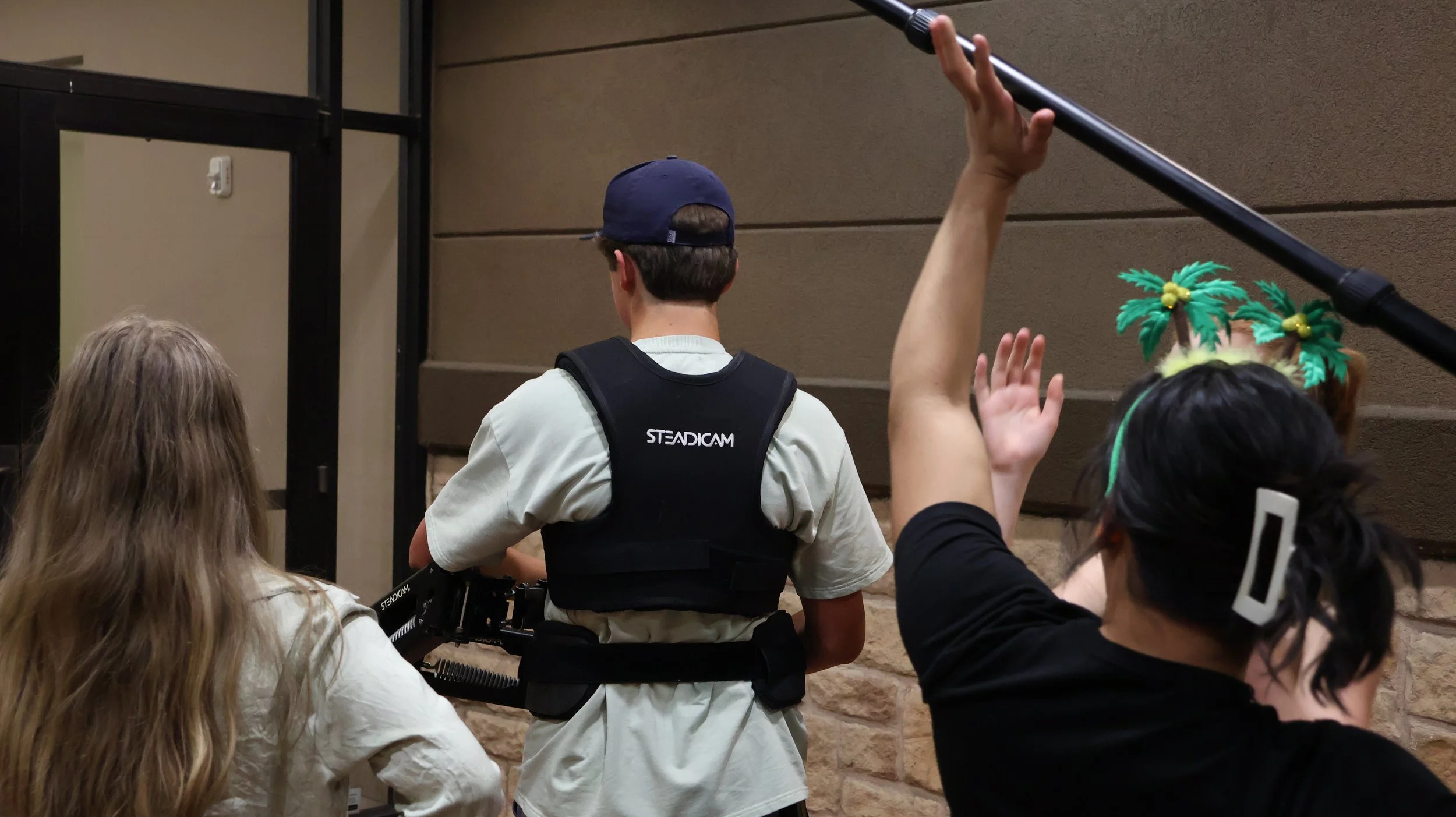 A film crew setting up a shot with a person in a white T-shirt and black vest, surrounded by crew members, one of whom is wearing a festive headband with palm trees and yellow balls, and another holding a boom microphone.