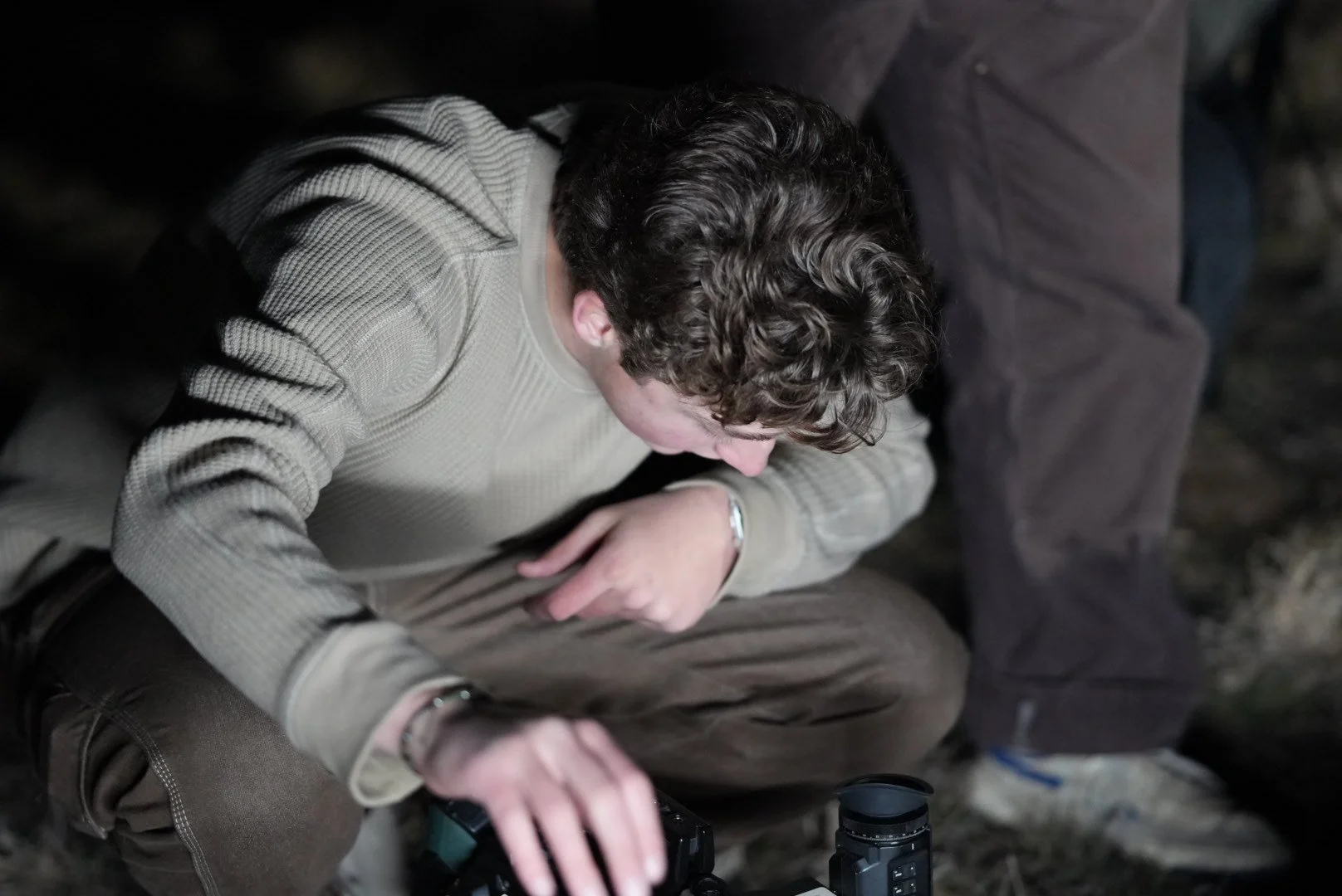 A person with curly brown hair is sitting on the ground, looking down at camera equipment, with a dark background. View fullsize