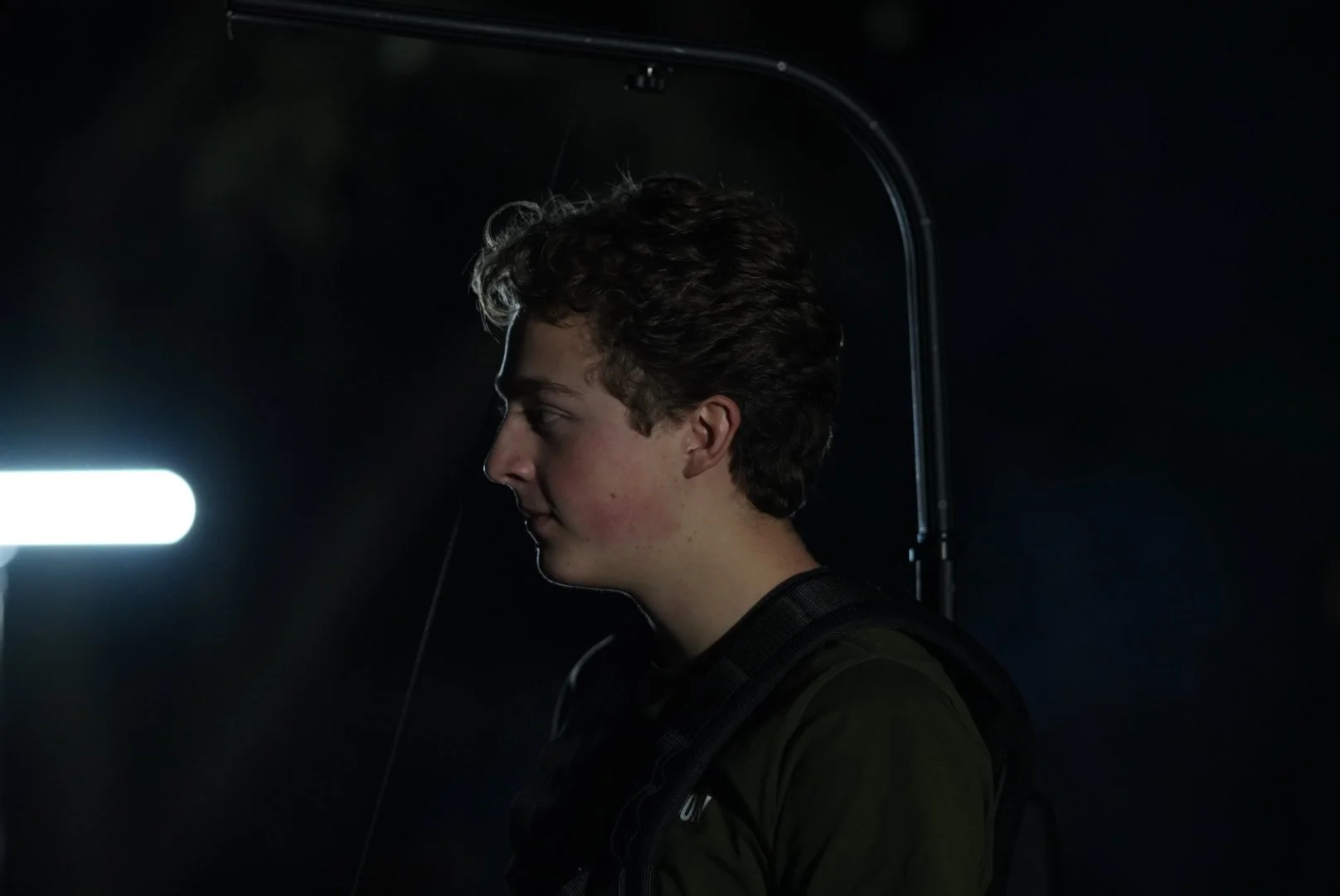 Profile of a young man with curly hair standing in a dark environment, illuminated by a bright light source on the left side.